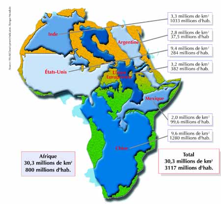 Il se susurre dans certaines chapelles bien pensantes que l’Afrique serait trop peuplée. La carte que vous avez ici entre les mains, réalisée par l’agence Sopel International, nous dit le contraire. La superficie du continent africain est égale à la somme des superficies de plusieurs pays associés à la puissance et au gigantisme : Etats-Unis, Chine, Inde, Argentine, Union européenne et Mexique. Sans vouloir entrer dans le débat fécond entre croissance du PIB et croissance démographique, concentrons-nous sur l’atout géographique du continent le plus riche au monde en réserves hydriques, en ressources minières et en terres cultivables.