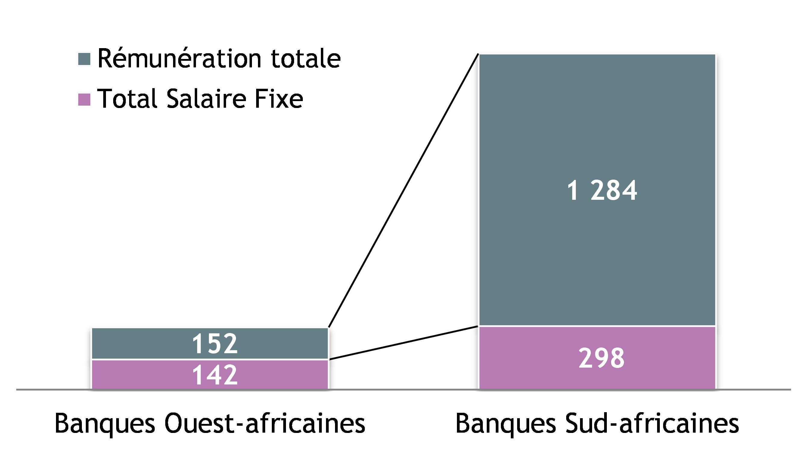 Le salaire fixe représente en moyenne 93% des revenus annuels bruts des Présidents- Directeurs Généraux et des Directeurs Généraux de ces structures exerçant dans la zone ouest-africaine. Le revenu annuel fixe représente à l’inverse en moyenne moins du quart de la rémunération brute annuelle enregistrée par les Dirigeants de banques sud-africaines.