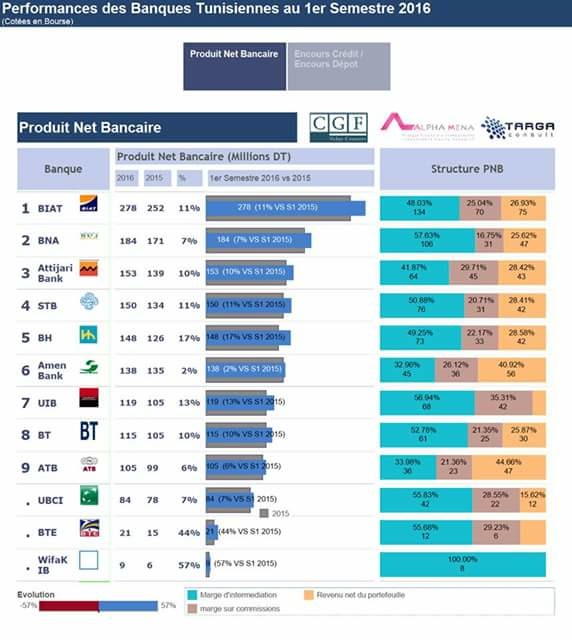 Pour les trois premières banques de la place, en tête du classement, la Banque internationale arabe de Tunisie (BIAT) a vu son Produit net bancaire (PNB) évoluer de 11% pour atteindre 278,3 millions de dinars.