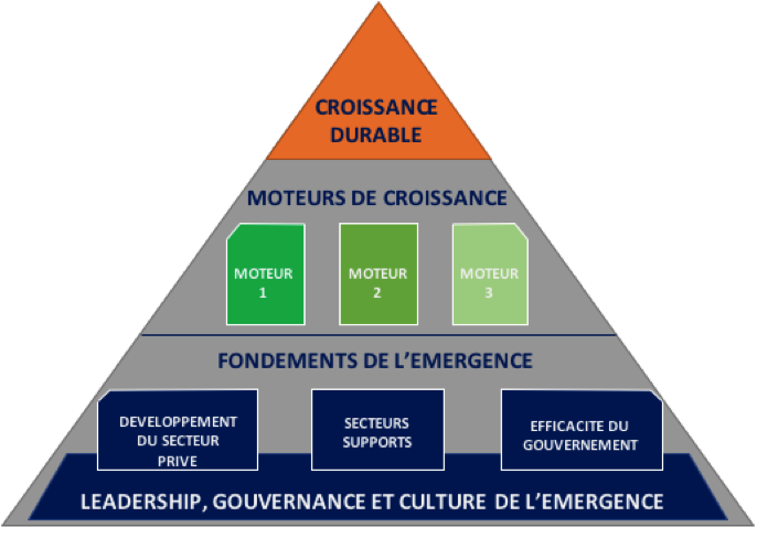 Le développement de moteurs de croissance est généralement facilité par quatre leviers d’action qui peuvent être qualifiées de fondements de l’émergence : i) le leadership, la gouvernance et la culture de l’émergence, ii) un gouvernement efficace et efficient, iii) un secteur privé dynamique dans un écosystème sophistiqué, iv) des services supports à la compétitivité globale de l’économie qui jouent pleinement leur rôle.