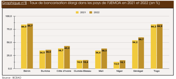 Taux de bancarisation élargi dans les pays de l’UEMOA en 2021 et 2022 (en %)