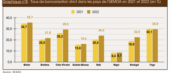 Taux de bancarisation strict dans les pays de l’UEMOA en 2021 et 2022 (en %)